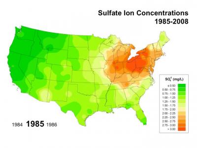 According to EPA data, sulfate emissions dropped more than 50 percent during the period covered by the study and nitrate emissions dropped more than 30 percent. The National Atmospheric Deposition Program report found that concentrations of corresponding acid ions in rainwater have dropped by similar magnitudes. In addition, frequency of acidic precipitation has decreased across the U.S.